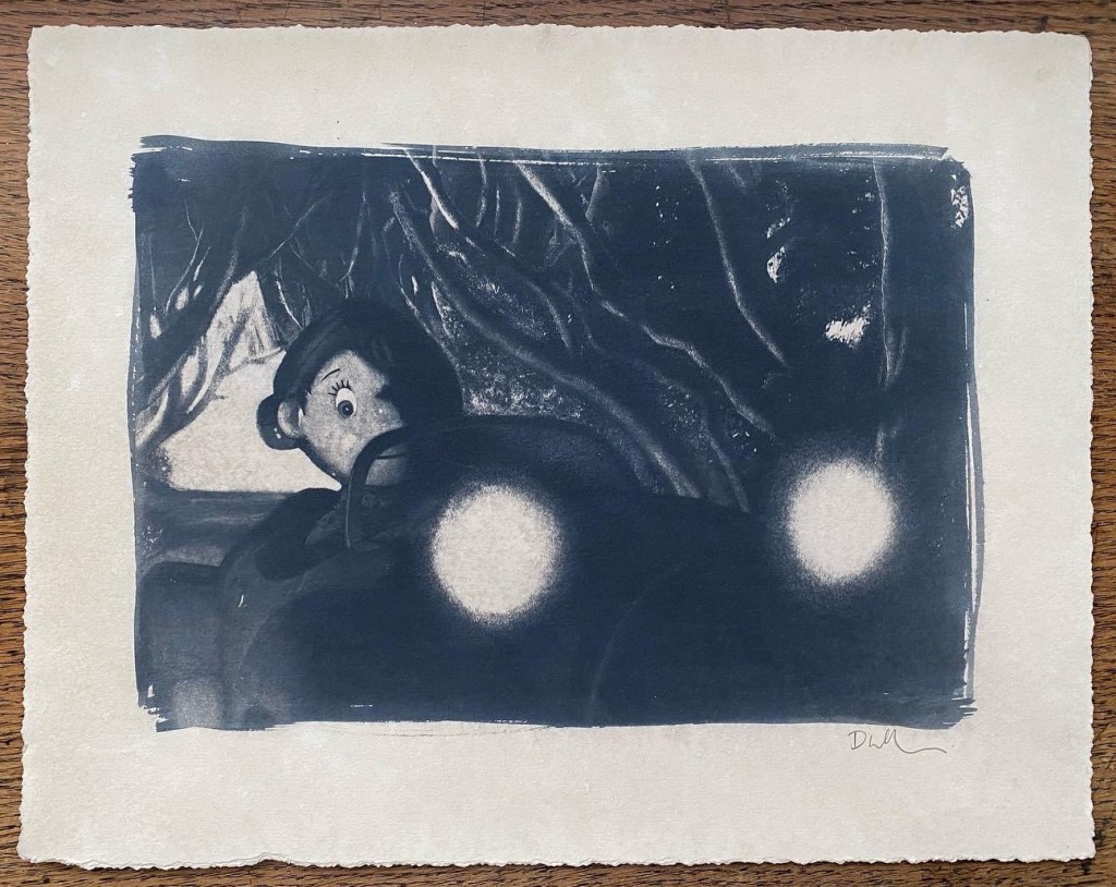 Now off to a new home. Noddy Noire – someone thinks they’re not in Kansas anymore. Oil on board 22x30cm (painting size). It was only a matter of time – our adventurous friend has made the leap from toy to drawing, then to Cyanotype print and finally a moody-ish little painting.