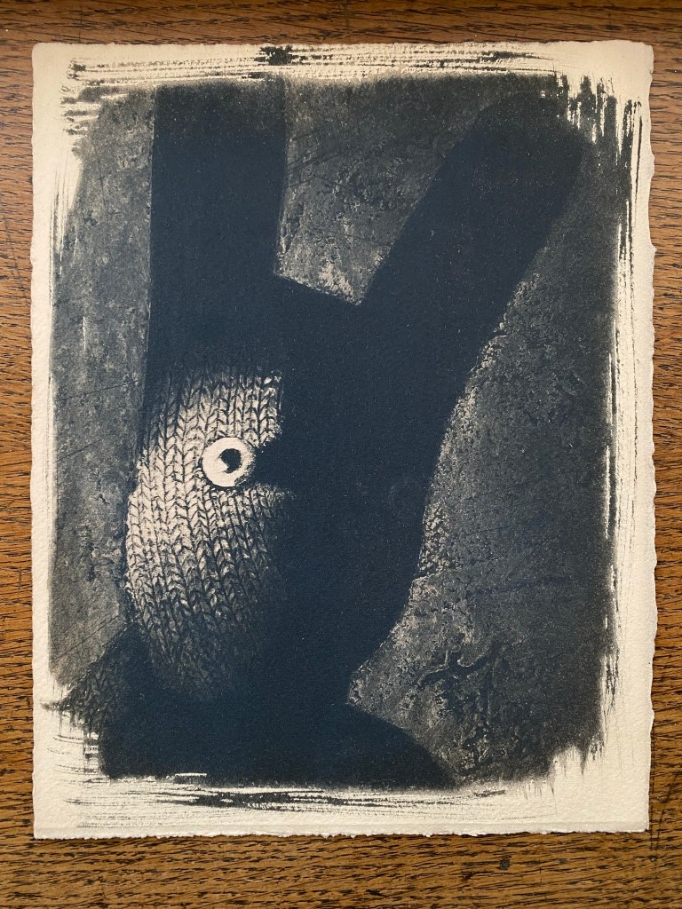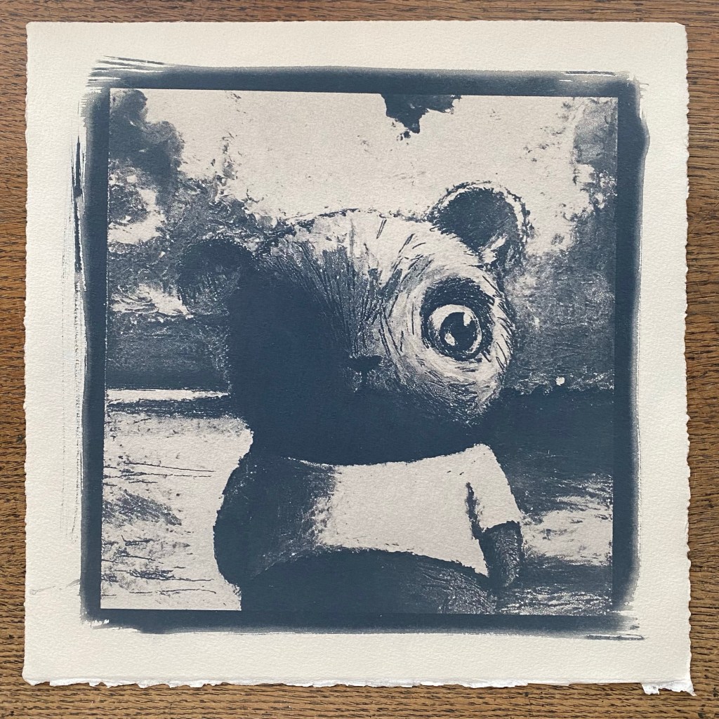 Toned Cyanotype No. 3. ‘Without You I’m Nothing’ 30x30cm on Arches Cotton Paper. The neutral expression of everyone’s best furry friend and confidante can seemingly take anything thrown at it. In a reflective moment, this little fella is wondering if he might not just be a tree falling in the woods. The grainy texture of Cyanotype on this paper makes me think of childhood books and has a slightly grainy lithographic feel which I am in love with. Watching these images appear and change, through the five stages of production reminds me of taking something from the Raku kiln – the sense of seeing something you’ve been working on for the first time, because science and nature have added their own hand to the piece. Addicted. X