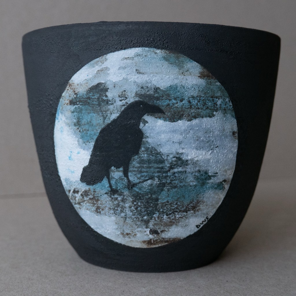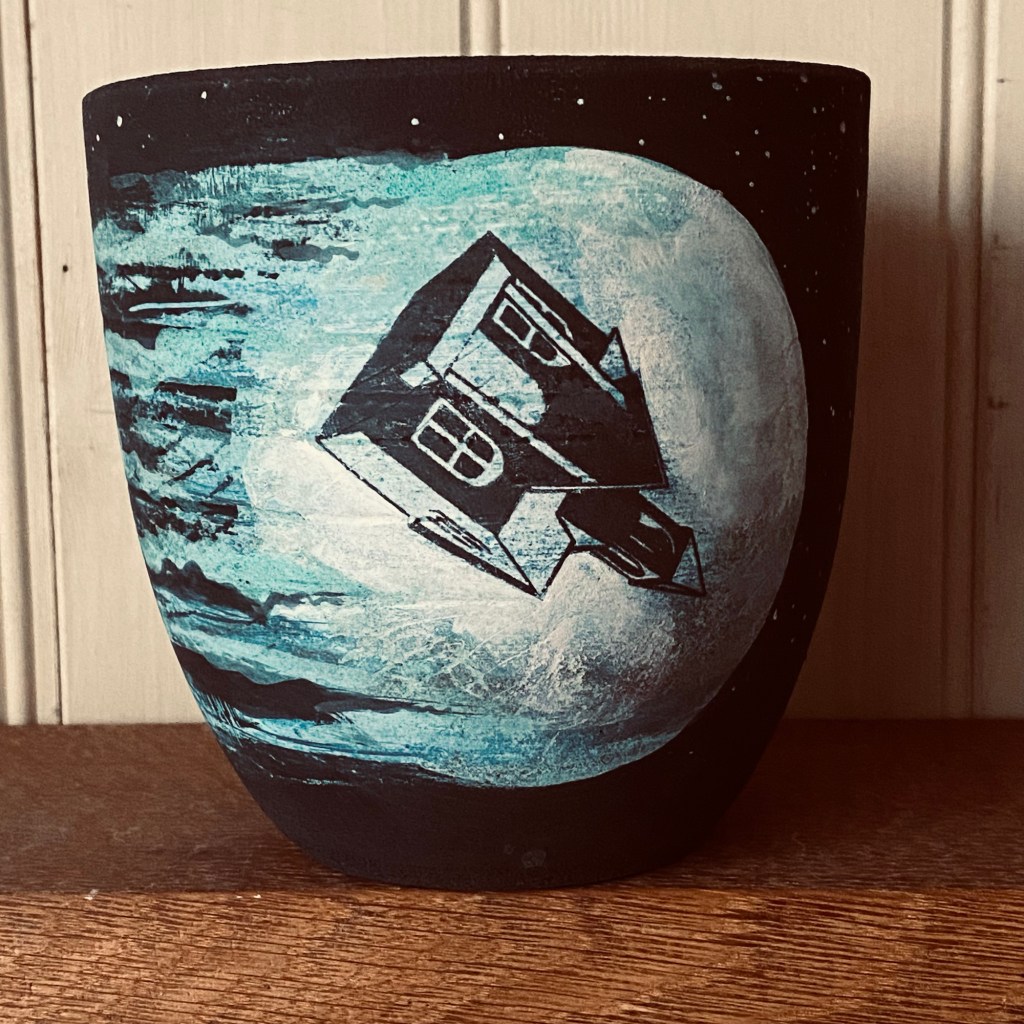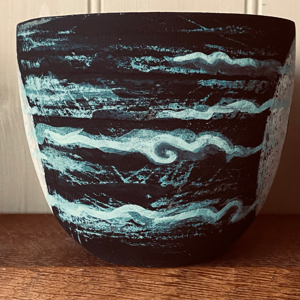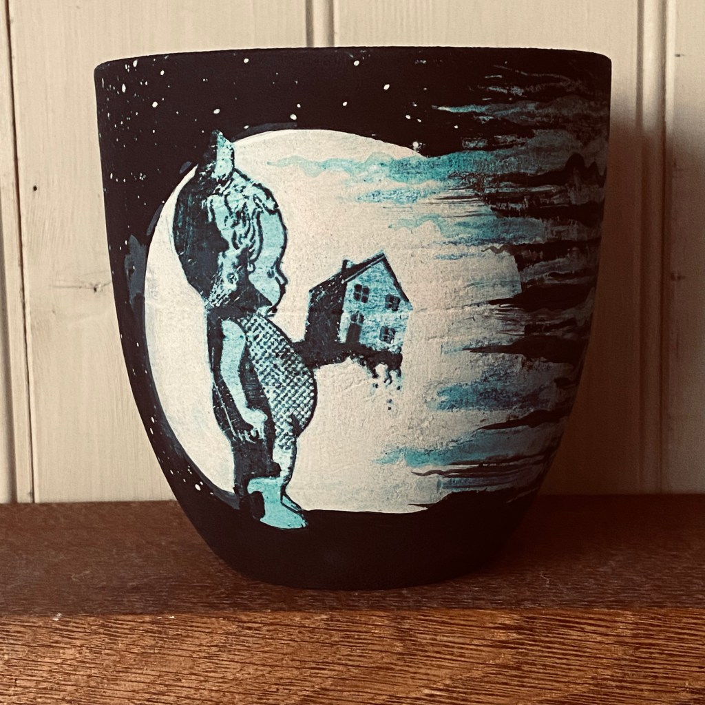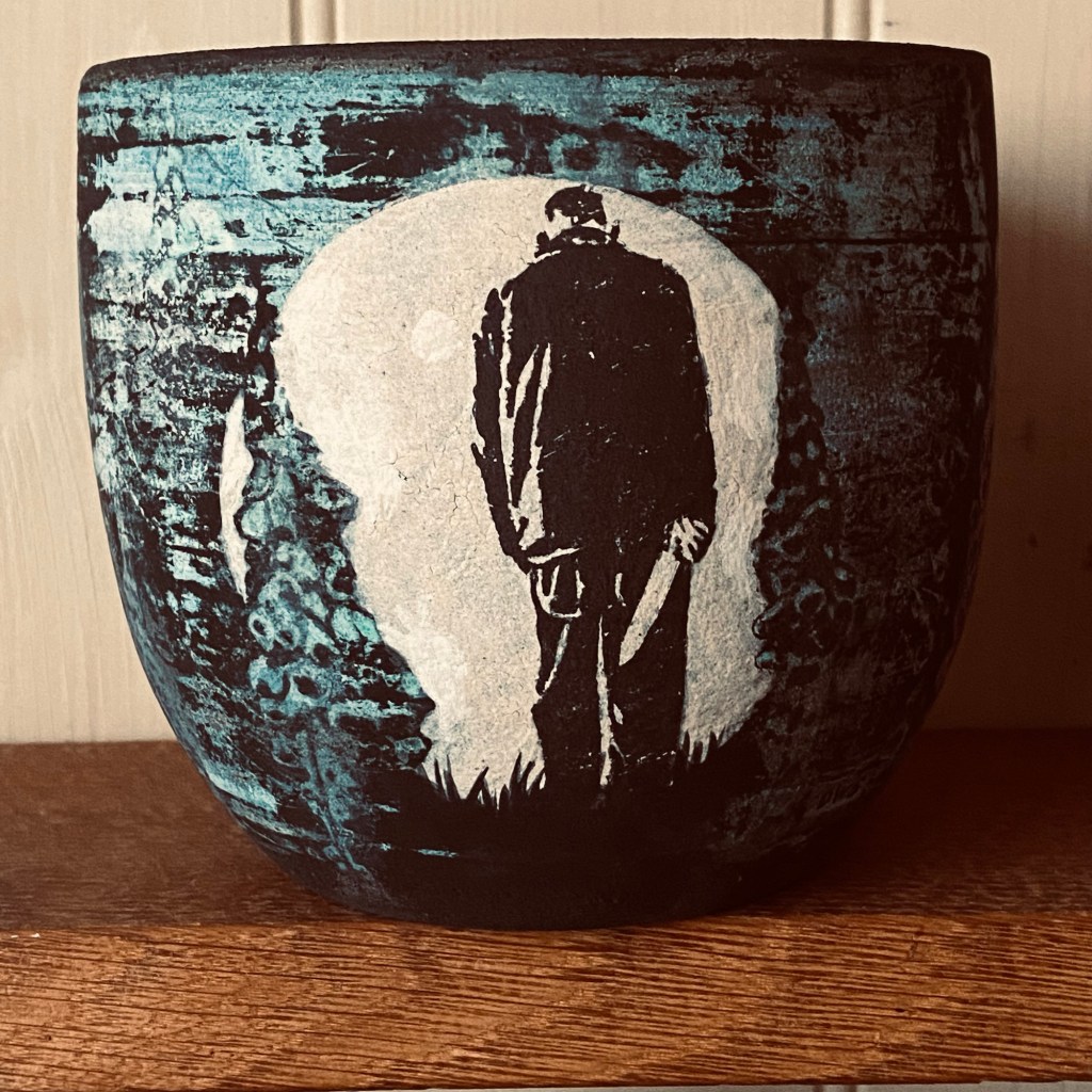 The first four pots pre final touch up and layers of illustration but now ready ready to face their last firing today, and for this final one, I’m taking them right up to stoneware temperatures to concentrate the black clay and perhaps get some unexpected burn off texture in the painting. Bit nervous about this one, it’s been four months of experimentation to get to this point so, one pot a month. Look at him go! Copious notes, photos and videos have been made, so should all go with a terrible bang today, once the tears have dried, I shall begin again. Sisyphus.
