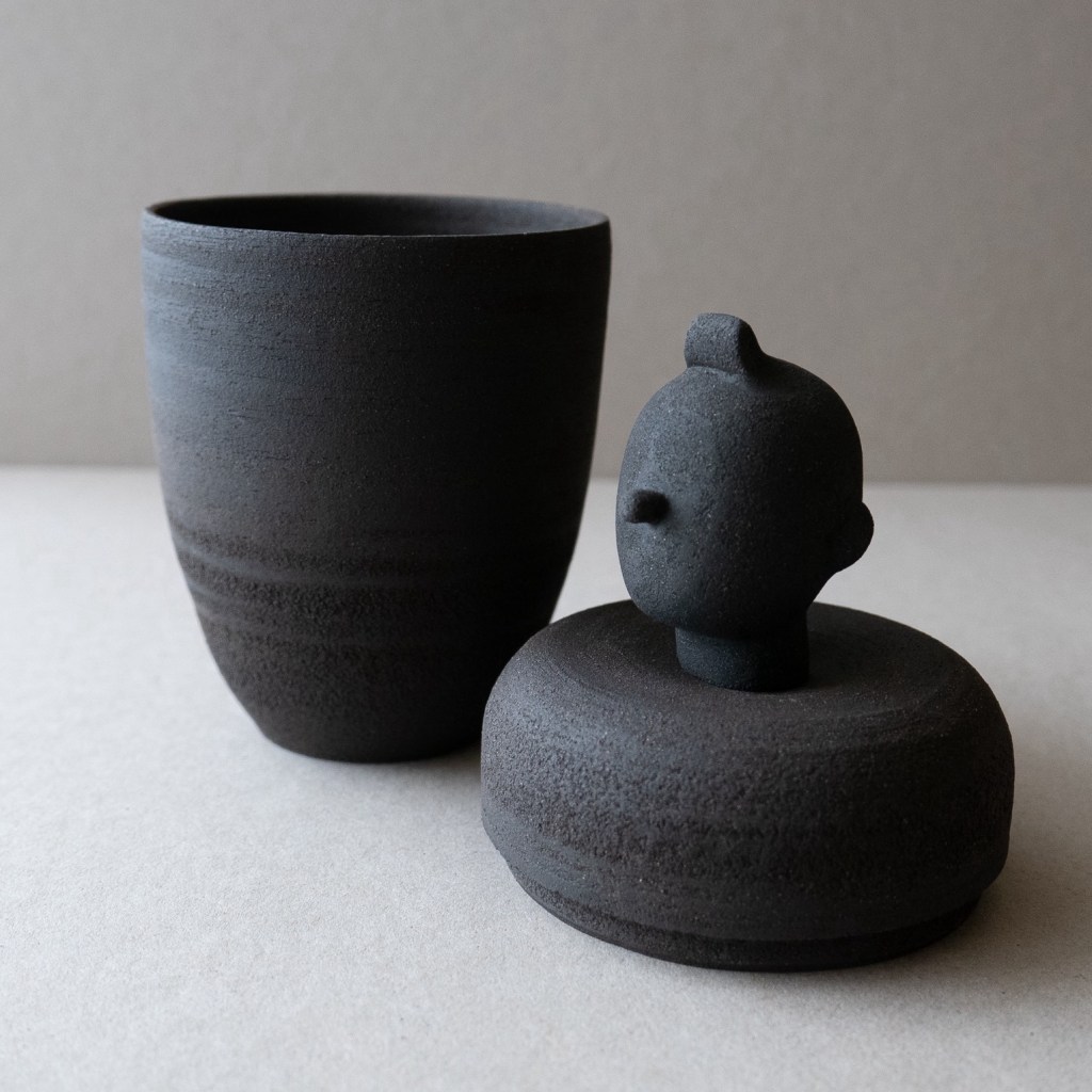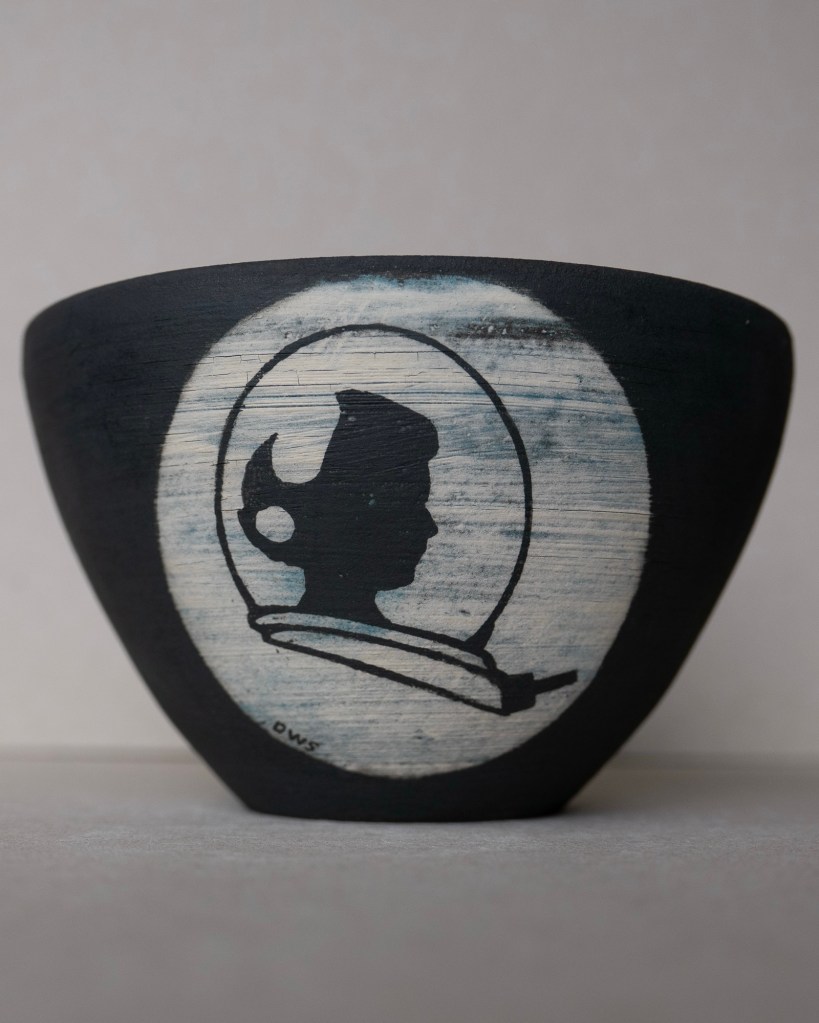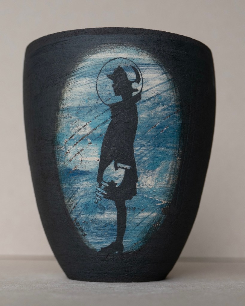 Canopic Contemporary Prototype no 1. Black Stoneware. £280. Between making my next series of narrative illustrated pots, l’ve been throwing shapes intended to remain in their raw state and fired high to a delicious smoky charcoal due to an inclusion of Manganese Dioxide in the clay. Obviously I have well and truly draped myself across the silhouette of ancient Egyptian canopic jars here, but as I go along, in all my work I’m imagining the work to be confounding if it were to be pulled from the earth in a millennia or two. Some of these jars (although not this one) part low down the body, and as such are deliberately impractical for regular use. Except perhaps as a time capsule? Well, I’m not expecting patrons buy one of these and then immediately toss it into the Thames, but the idea certainly appeals. Anyone feeling bold?
