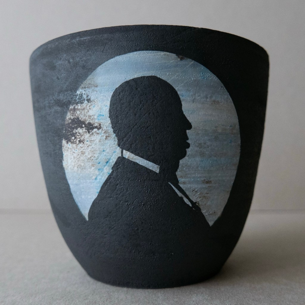 Primrose, John and Victoria. Hand Thrown Stoneware Vessels with slips, stains and engobes. I’ve been conferring with the lovely people at the National Portrait Gallery and they have very kindly given me the green light to work on a pottery project in which I bravely, nay cockily, restyle the divine paper silhouettes cut by Hubert Leslie in his studio on Brighton’s West Pier in the 20s and 30s. Hubert made tens of thousands of these portraits and they are deeply redolent of their time, his subjects are utterly real, we know them, but there is a subtle stylisation in his clarity of line, Wodehousian and Cluedo-esque. My thing. I wanted to avoid  pastiche, I hate the idea of making something which is meant to look from another period (or even my own period when I come to think about it), yet I’m intoxicated by these very evocative images. So I decided to pluck these characters from their day on the prom, and set them firmly back down, recast in new roles in an entirely different landscape, (albeit in the case of my first three subjects, one in the imaginative world of THEIR time). They could be on their way to a fancy dress parade, they may be dreaming of another life, or we may just have a multiverse situation going on here. We will most likely never know.