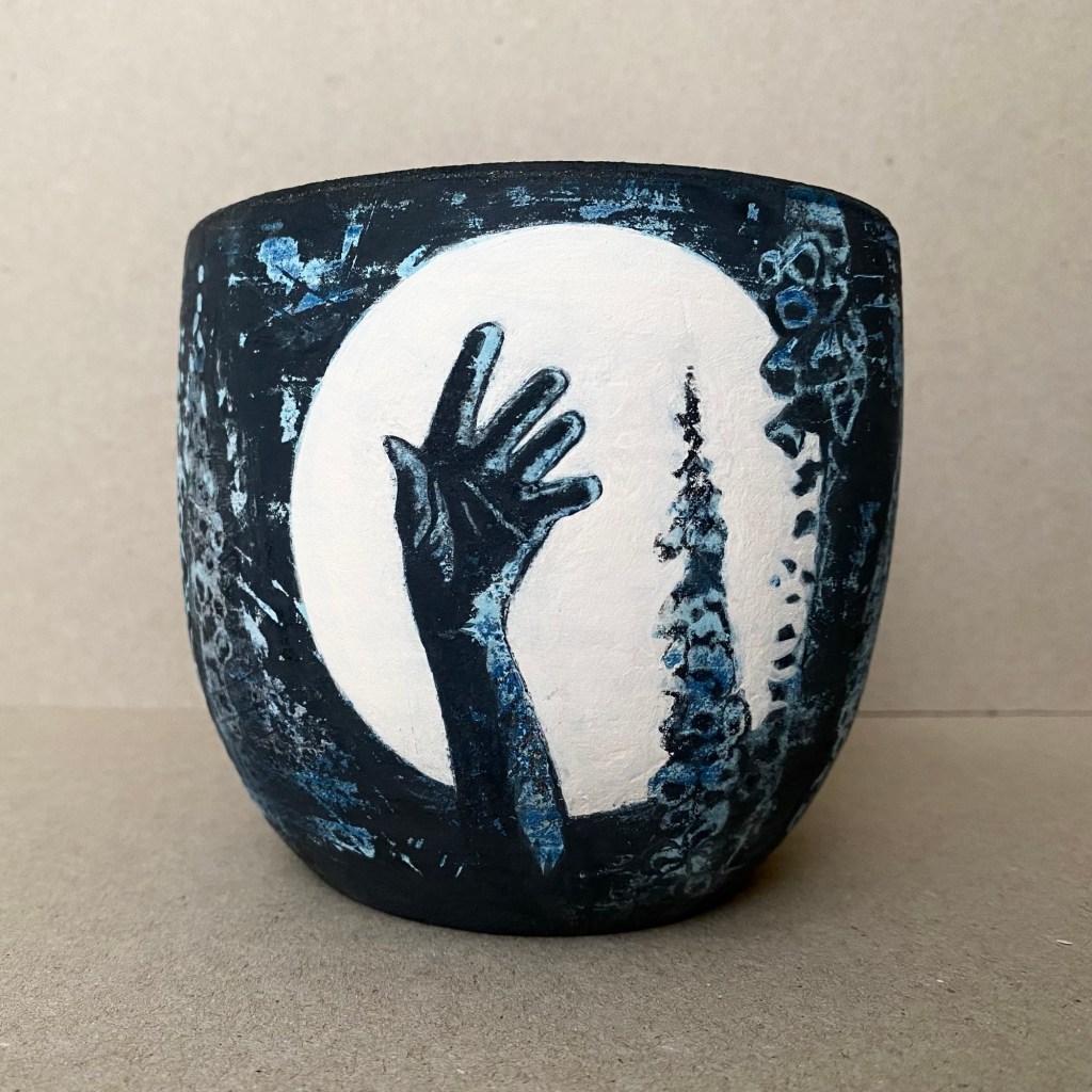 Well the first pot is ready to face the kiln again, and so deserves a short film and a little sing-song. Not the one I intended to start with, but the one that elbowed its way to the head of the queue. This one, titled ‘The Flowers’, is the first of a Mystery Noire series which seems to have sprung directly from my passion for movie title sequences mixed with more than a whiff of graphic novel aesthetic. I’ve been working on a visual and technical formula to balance a comic book vibe with a painterly approach to the backgrounds. I’m used to working in oil paints where what you see is what you get – this medium is less intense than it will be once fired on and fused to the ceramic surface, and I shall have to wait to see what emerges from the furnace. Between painted layers sit silkscreen prints sometimes applied directly to the pot, sometimes onto Japanese tissue and carefully transferred, followed by much rubbing, scraping and sanding, spattering, hacking and then re-painting here and there. At times this feels very two steps forward and fourteen back, but really this is the only way to get the battered, exhumed look I’m going for with this series. #handthrown #thriller #noire #graphicnovel #comicbook #illustration #ceramic #pottery #studiopottery #oneoff